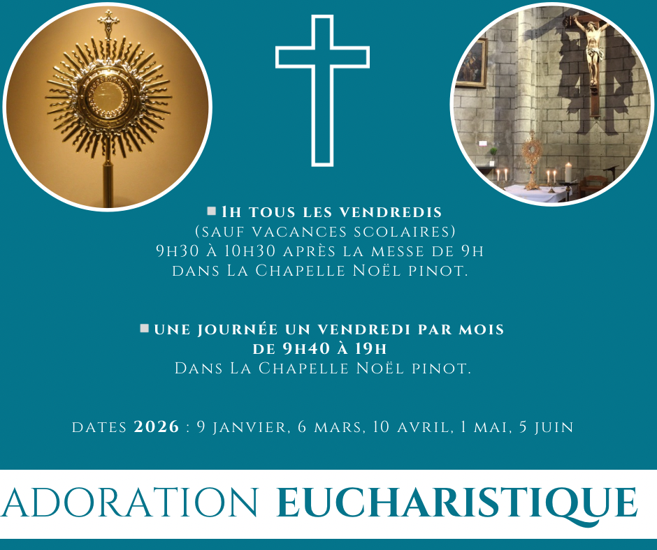 – Pour le lieu, tous ces temps d’adoration sont à la chapelle Noël Pinot (27 rue St Joseph)