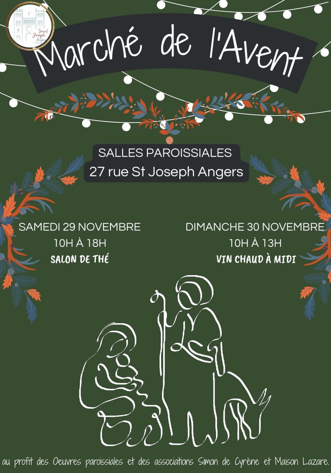 Le Marché de l’Avent de la Paroisse St Joseph se tiendra dans les salles paroissiales, 27 rue St Joseph à Angers, le samedi 29 novembre de 10h à 18h, et le dimanche 30 novembre de 10h à 13h avec un café offert à 10h30 et le traditionnel vin chaud après la messe de 11h. Les bénéfices seront partagés entre les œuvres paroissiales et les associations Simon de Cyrène et Maison Lazare. Venez nombreux pour passer un moment convivial et aider avec vos dons les associations partenaires