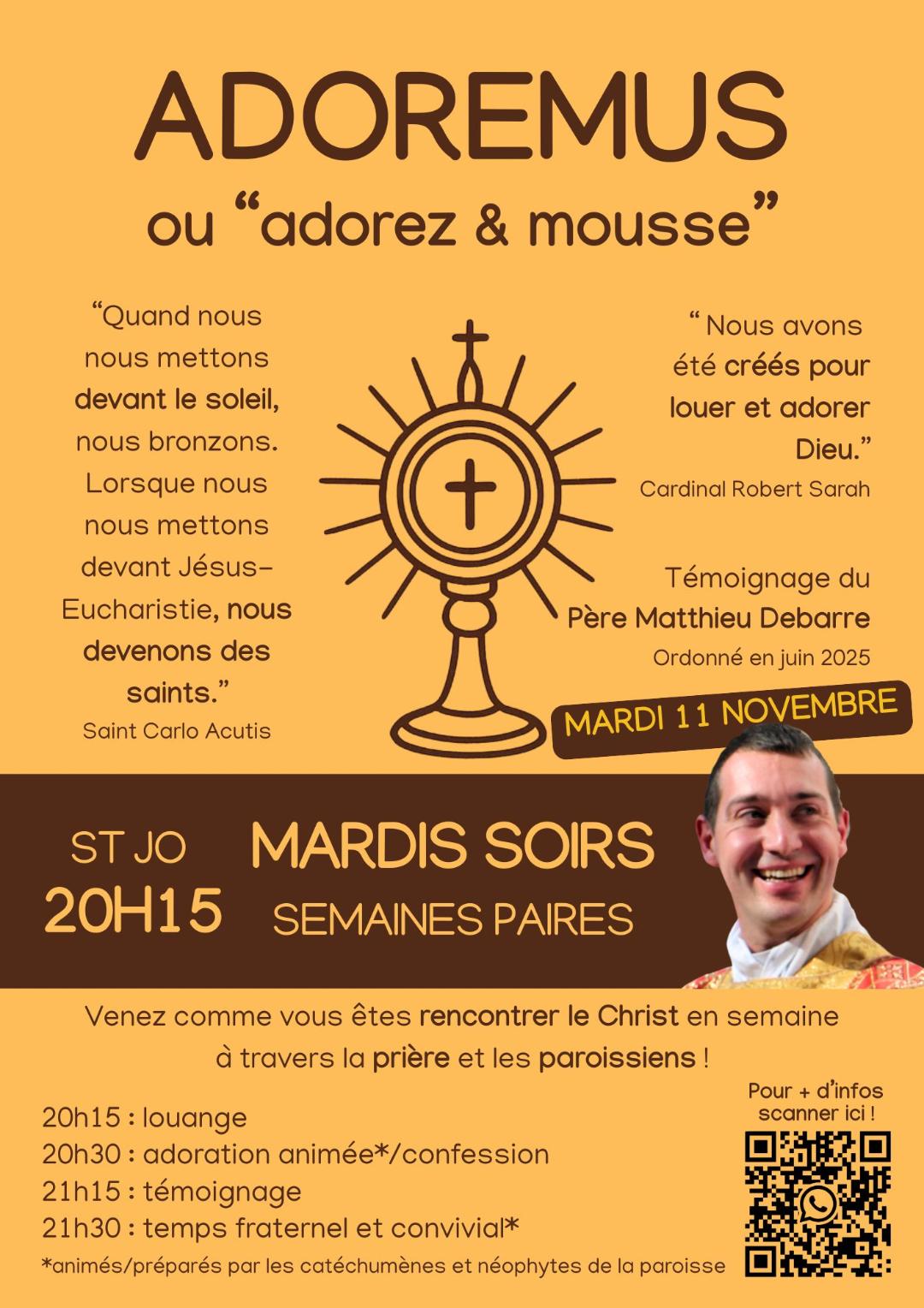 Le MARDI 11 NOVEMBRE aura lieu la première soirée d’adoration/confession animée dans l’église Saint Joseph à partir 20h15. Nous aurons la joie d’écouter le témoignage du père Matthieu Débarre ordonné en juin dernier dans notre diocèse. Cette proposition s’adresse à tous ceux qui souhaitent rencontrer en semaine le Seigneur et d’autres paroissiens. Une petite « mousse » vous sera proposée à la suite du témoignage.