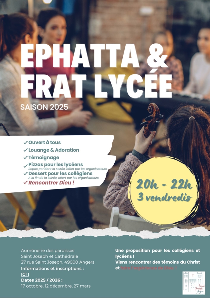 Pour tous les lycéens : même esprit fraternel, même lieu, Soirées Ephatta collégiens , et Frat’lycéenne ✝️🕊️🔥🤩même joie de se retrouver ! Pizzas offertes par les organisateurs.
